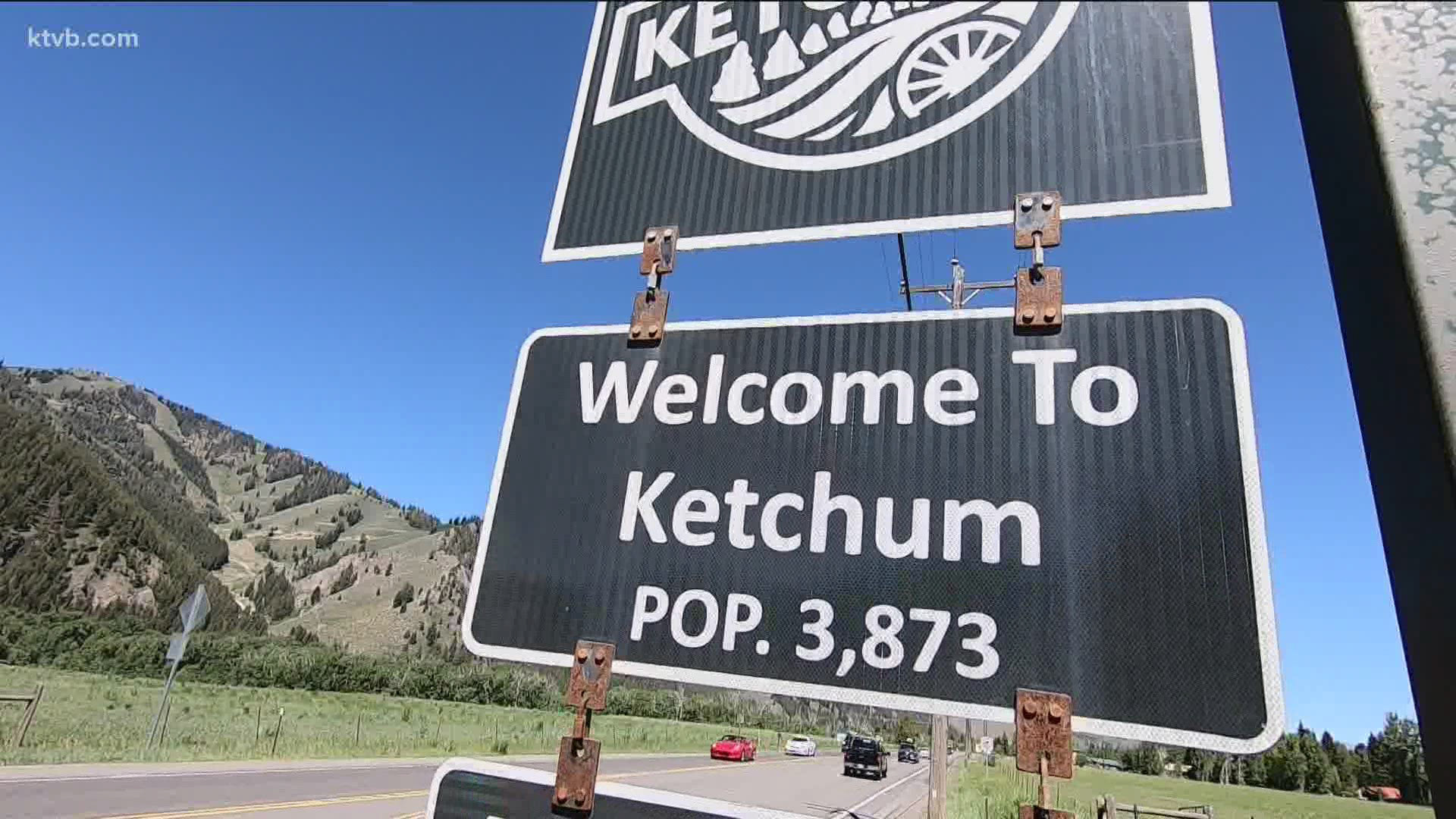 This is a horizontal, color photograph of the blue, Welcome to Idaho sign at the state line crossing over from Wyoming. Green trees fill the mountains in the background.
